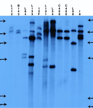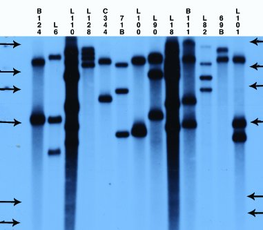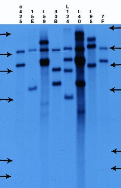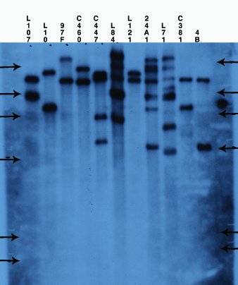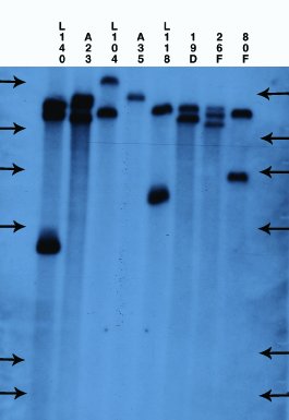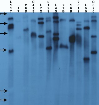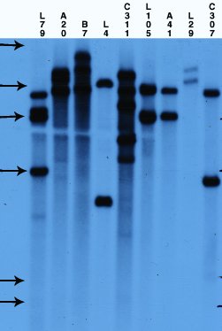 CAUT home | Background and theory | Working with the CAUT lines Genetics | Generation of the CAUT lines | Seed irradiation and sector analysis 3. Verification of the CAUT lines.The CAUT lines are phenotypically identical and all are full green and kanamycin resistant. So it is fairly easy to mix them up and ruin your cell-autonomy experiment by using the wrong one. As such errors do happen in any lab a simple and robust method of line verification has been developed. The method is based on Southern blots, T-DNA probes and comparisons to blots run in the Furner lab (see thumbnails below).The parental ch-42 mutant is tagged with a T-DNA containing a promoter less and silent neomycin phosphotransferase and an active hygromycin phosphotransferase conferring hygromycin resistance. The T-DNA also contains a pBR322 copy. Homozygous ch-42 plants are yellow in soil and grow to maturity. Southern blots of DNA from this line prepared with ECORI and probed with pUC18 have a single 9kb fragment corresponding to the tag. The pCV002GC plasmid used to generate the CAUT lines also has a pBR322 region near the left border (Koncz et al, 1990 The EMBO Journal 9; 1337-1346.). There is one ECORI site in the T-DNA to the right of the pBR322 region. In the transformed plants a second ECORI site is found in the adjacent flanking plant DNA. The second site varies between integration events and therefore between lines. All of the lines are homozygous for a single correction but there can be multiple T-DNA copies at that site. The CAUT lines were made by introducing the correcting T-DNA into the ch-42 mutant. After recurrent back crosses, the single correcting insertions were made homozygous. Southern blots of these lines made with genomic DNA digested with ECORI and probed with pUC18 show a characteristic pattern. All lines have a 9kb band corresponding to the tag at ch-42 on chromosome 4. In addition all lines have one or more bands of varying sizes corresponding to the correcting CH-42 insert at the new location. The fragment pattern is unique to each line and can be used as a distinctive fingerprint to verify the identity of a line. Below are 7 blots corresponding to the inserts of the 5 chromosomes (chromosomes 1 and 4 are on two blots). The arrows are the positions of lambda HindIII fragments and the sizes (from the top) are: 23.1, 9.4, 6.6, 4.4, 2.3 and 2.0 KB. All lines have the 9kb fragment but there is slight variation in the migration of the fragment.