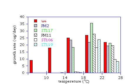 Growth rate. To determine the critical temperature for growth of the class 1 mutants, plants were grown at 22C until 7 days old. Pots were then transferred to growth chambers set at different temperatures. Five plants were removed and weighed separately every 3 days for 15 days. The average weight was plotted against the number of days at the chilling temperature, then the growth rate was calculated from the linear section of the graph.